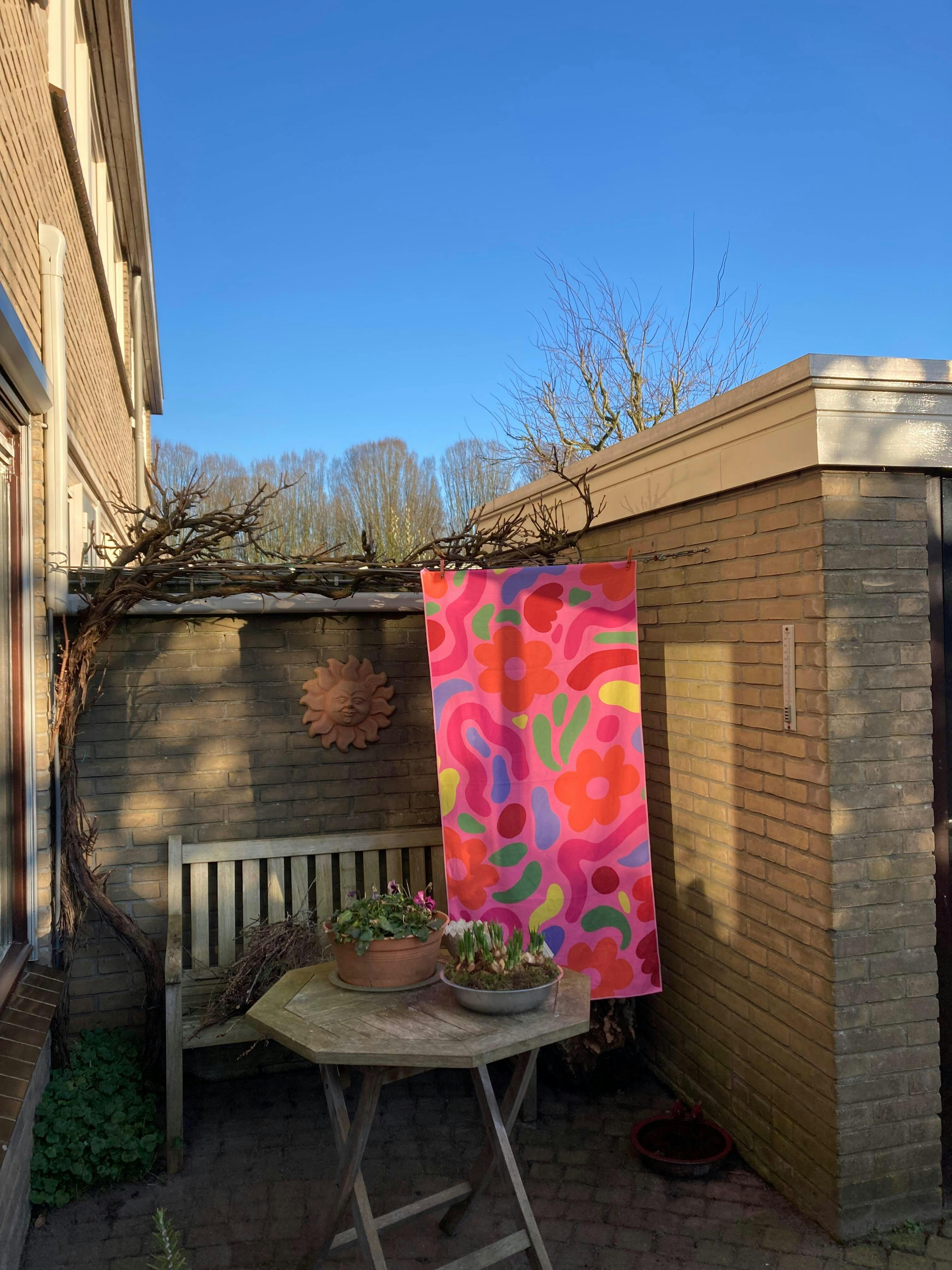 De hele zomer genoten we van de kleurrijke ‘bekleding’ van onze tuinbank. Werd het te warm dan namen we een duik in het zwembad, droogden ons af en ploften weer op de mooie doeken.